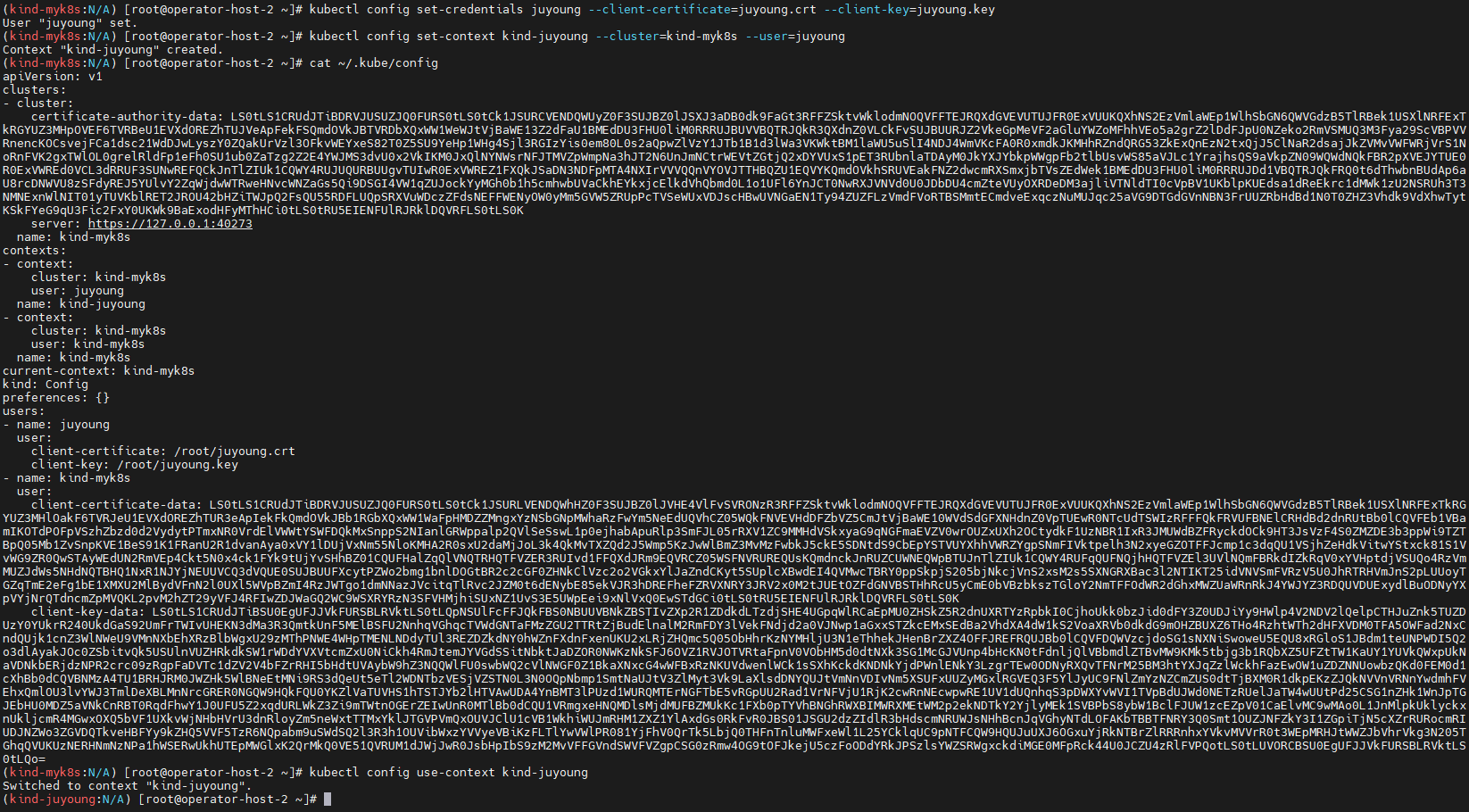 새로운 관리자를 위한 인증서가 발급되었으면, 이를 kubeconfig에 등록하여 해당 사용자가 Kubernetes 클러스터에 접근할 수 있도록 설정해야 합니다. 아래 명령어를 통해 신규 사용자의 인증서를 적용하고, 새로운 Kubernetes 컨텍스트(context)를 생성합니다.