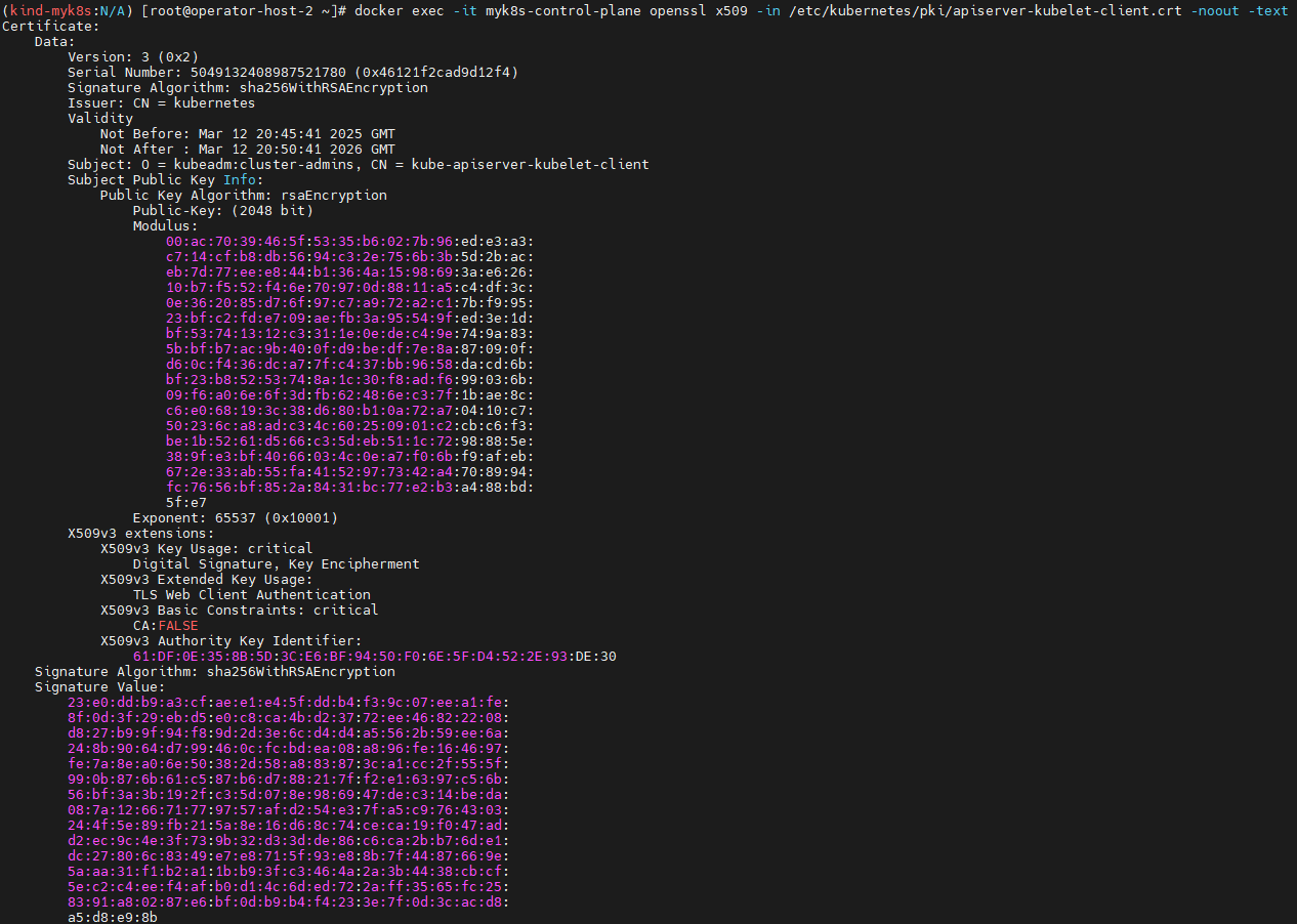 docker exec -it myk8s-control-plane openssl x509 -in /etc/kubernetes/pki/apiserver-kubelet-client.crt -noout -text