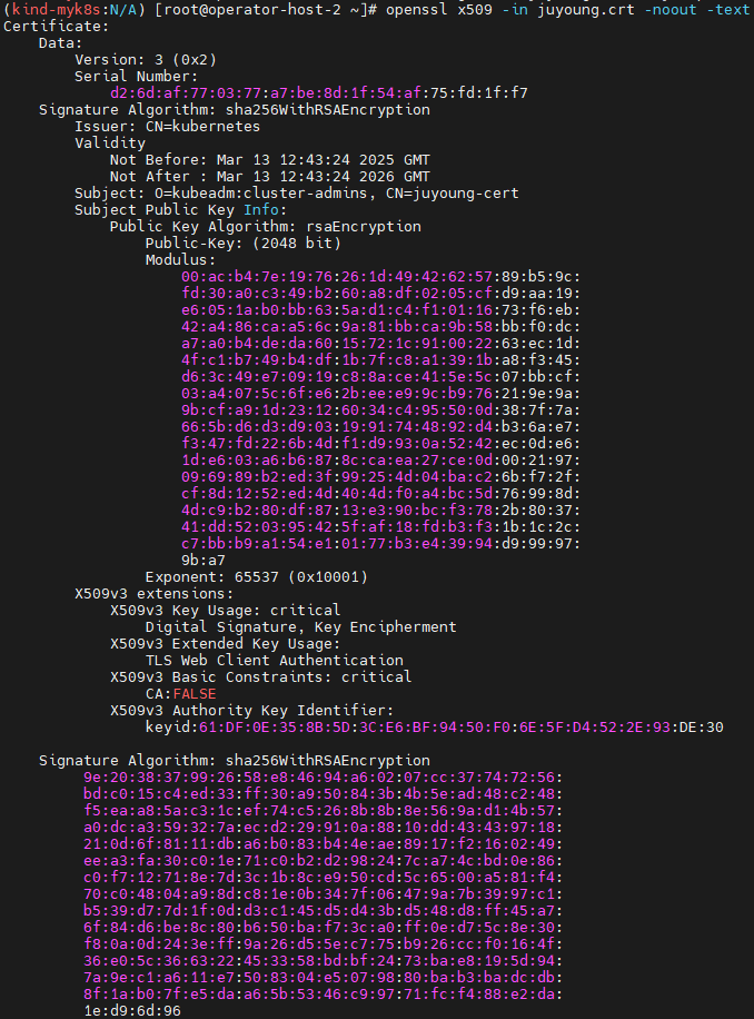 O=kubeadm:cluster-admins, CN=kubernetes-admin은 Kubernetes 클러스터 관리자로 지정된 사용자임