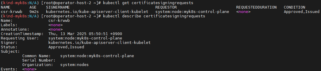 csr-852t8 4m14s kubernetes.io/kube-apiserver-client-kubelet system:node:myk8s-control-plane Approved,Issued