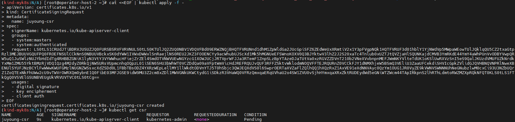 이 과정이 완료되면 kubectl get csr 명령어를 사용하여 요청된 CSR이 보류(Pending) 상태인지 확인할 수 있습니다. 관리자가 해당 요청을 승인하면 인증서가 발급됩니다.
