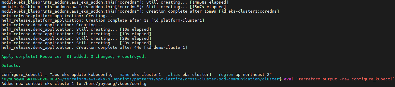 # 배포 완료 후, 아래 명령으로 kubectl config 설정을 완료합니다.