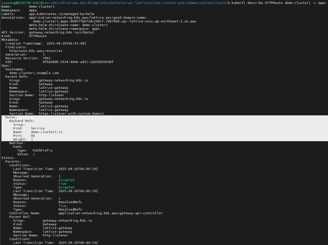 HTTPRoute에 적용되어 있음을 알 수 있습니다.kubectl describe HTTPRoute demo-cluster1 -n apps