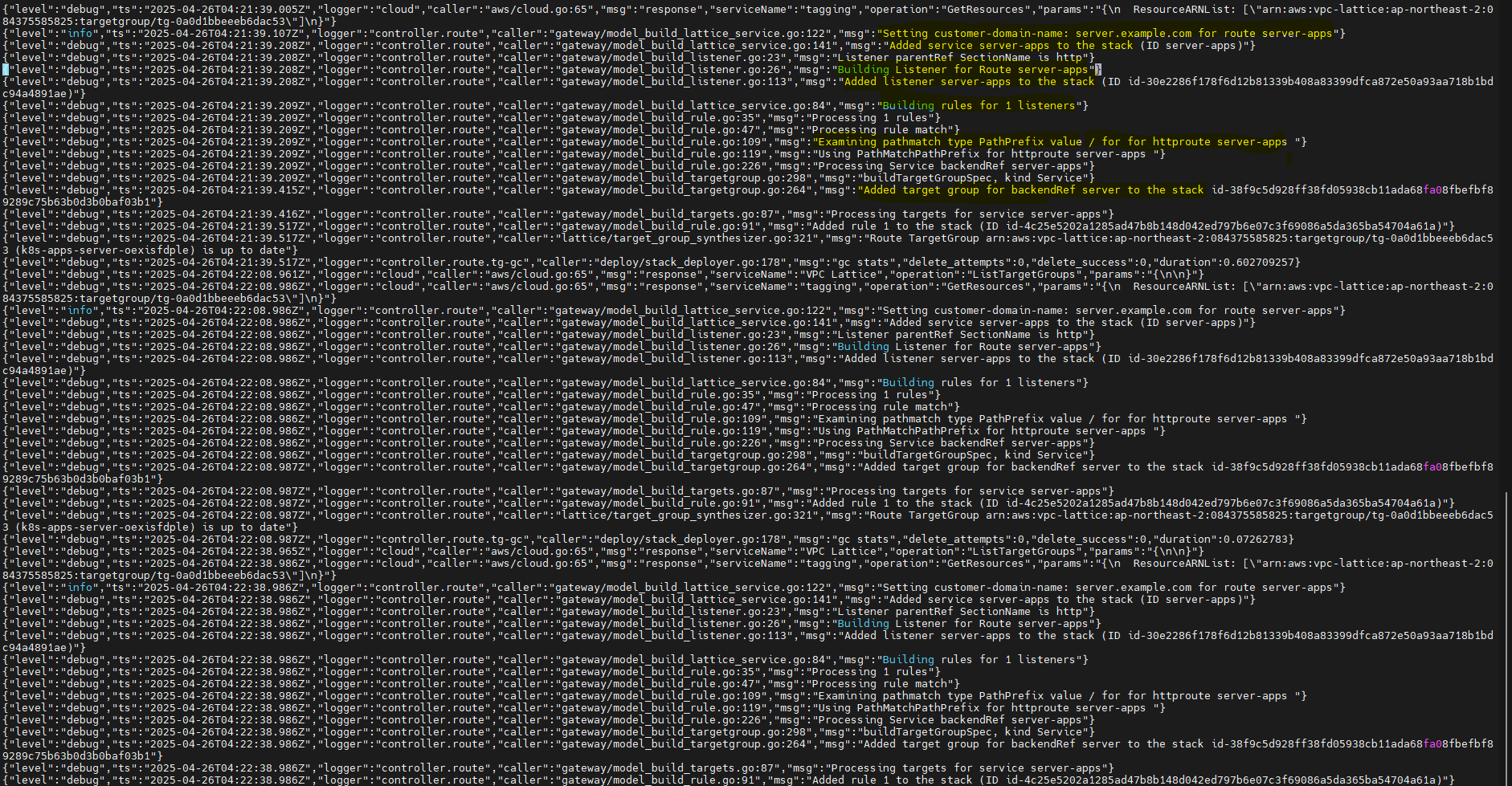 kubectl logs deployment/aws-gateway-api-controller-aws-gateway-controller-chart -n aws-application-networking-system --all-containers=true > lattice.log