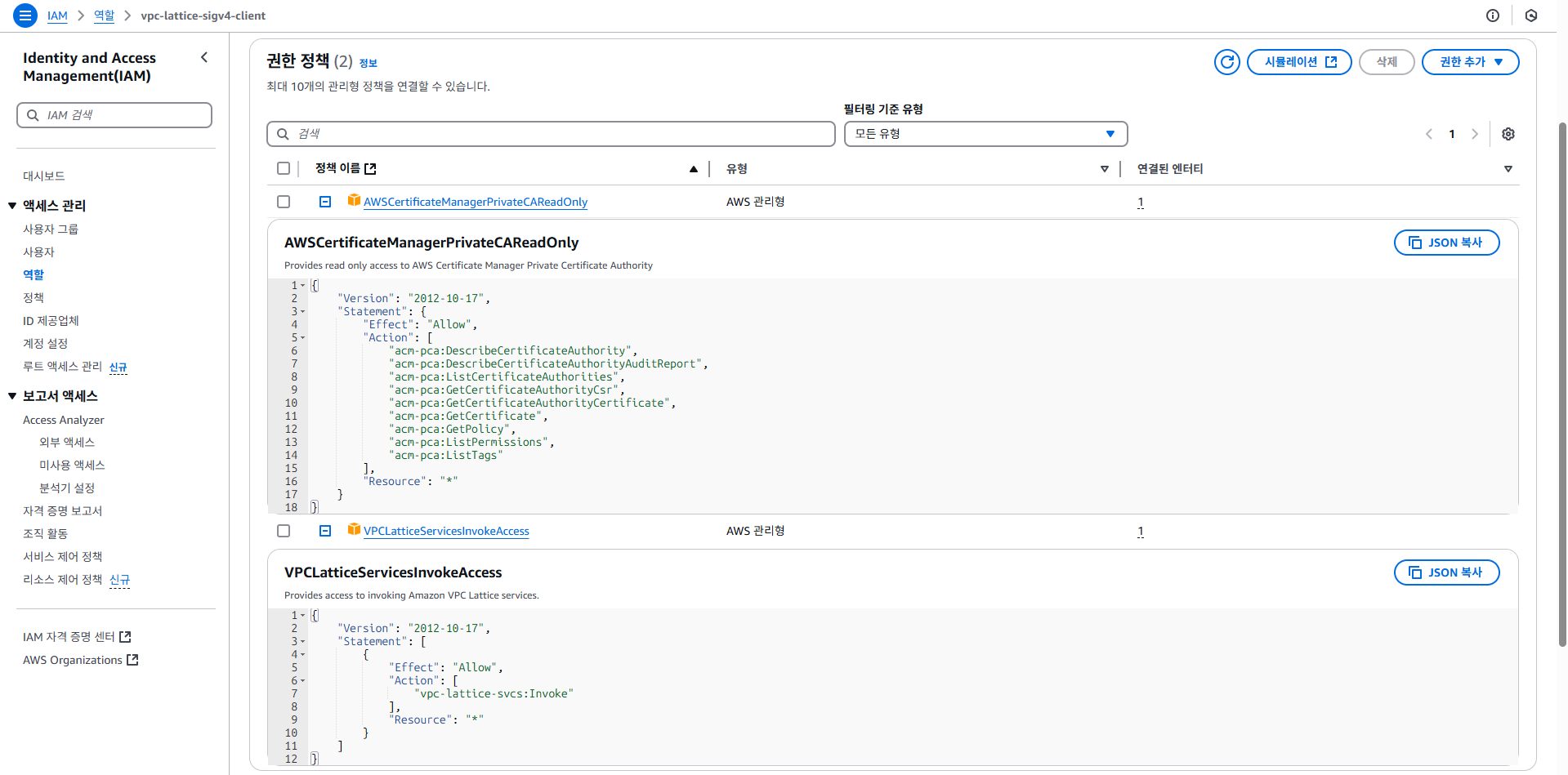 네임스페이스의 default ServiceAccount에 vpc-lattice-sig4-client