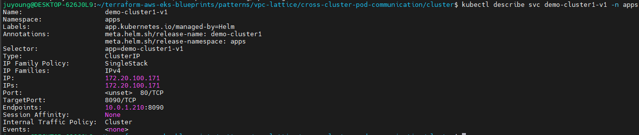 Service로 라우팅됨을 확인할 수 있습니다.kubectl describe svc demo-cluster1-v1 -n apps