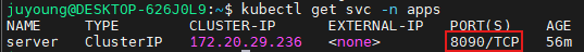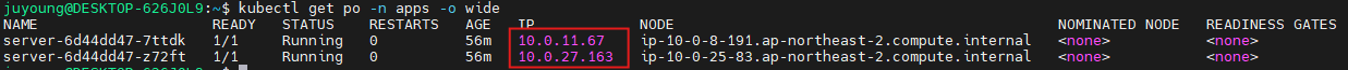 명령으로 server pod의 IP를 확인할 수 있고,kubectl get svc -n apps