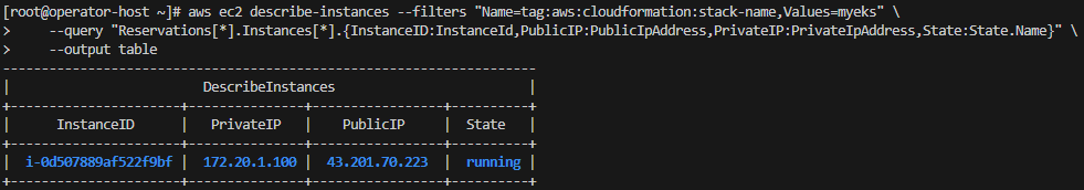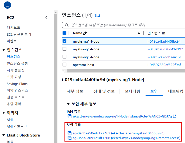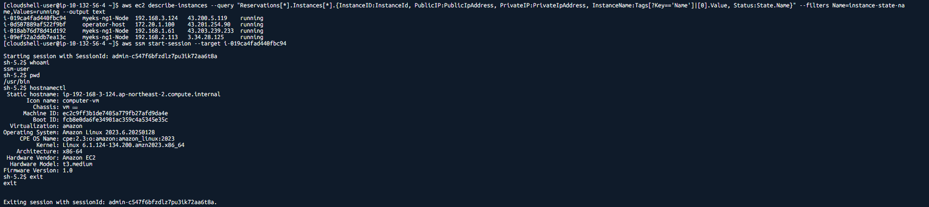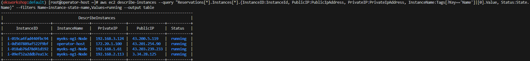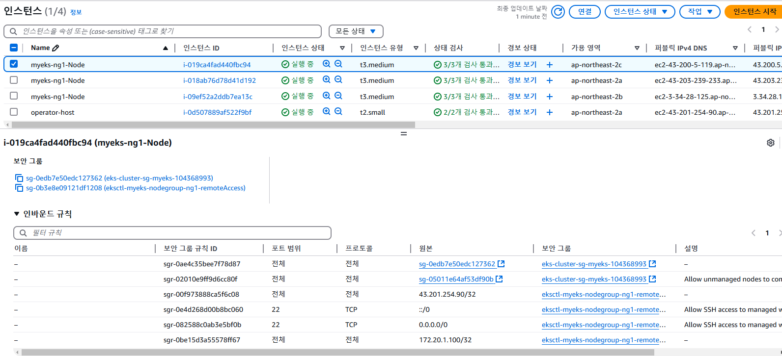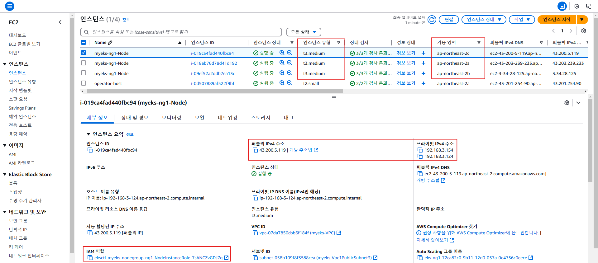 EKS 클러스터에서 실행 중인 EC2 인스턴스의 공인(Public) 및 사설(Private) IP를 확인하고 변수로 저장합니다.
