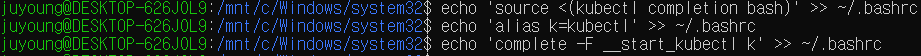 echo 'complete -F __start_kubectl k' >> ~/.bashrc