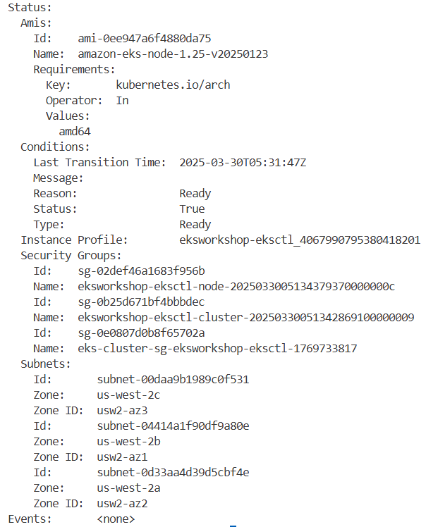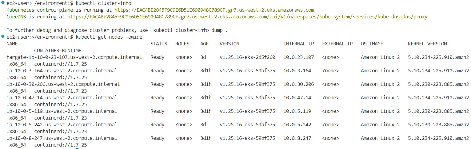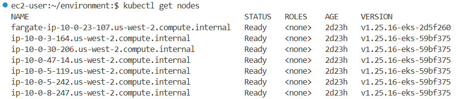 fargate-ip-10-0-41-147.us-west-2.compute.internal Ready <none> 31h v1.25.16-eks-2d5f260 10.0.41.147 <none> Amazon Linux 2 5.10.234-225.910.amzn2.x86_64 containerd://1.7.25