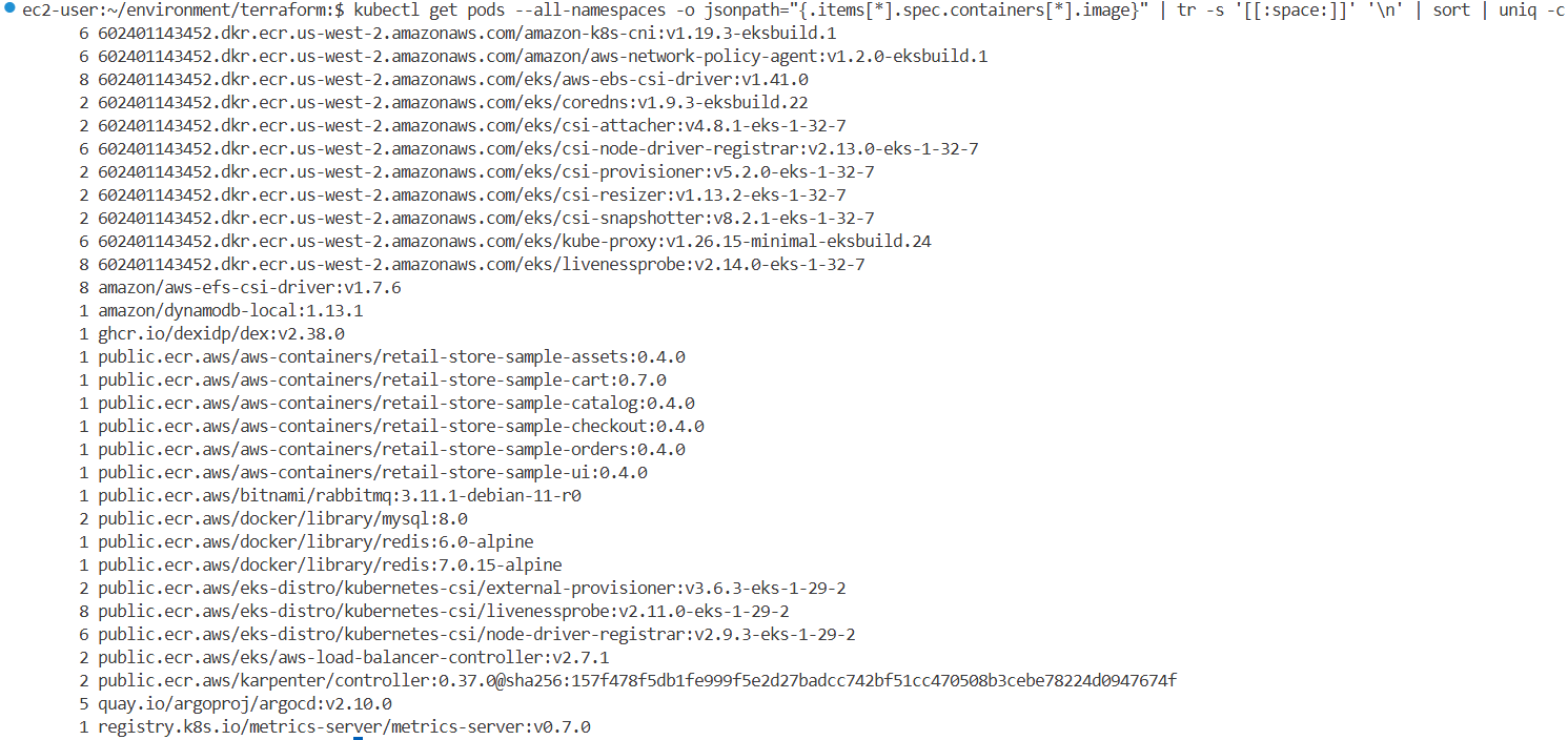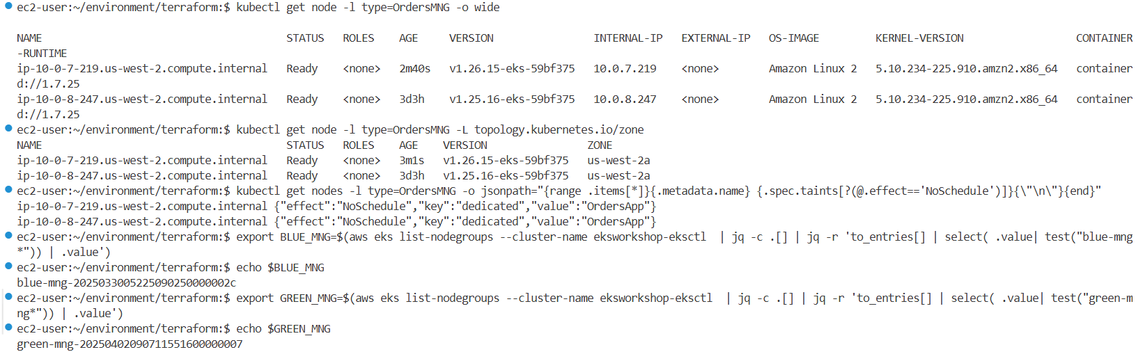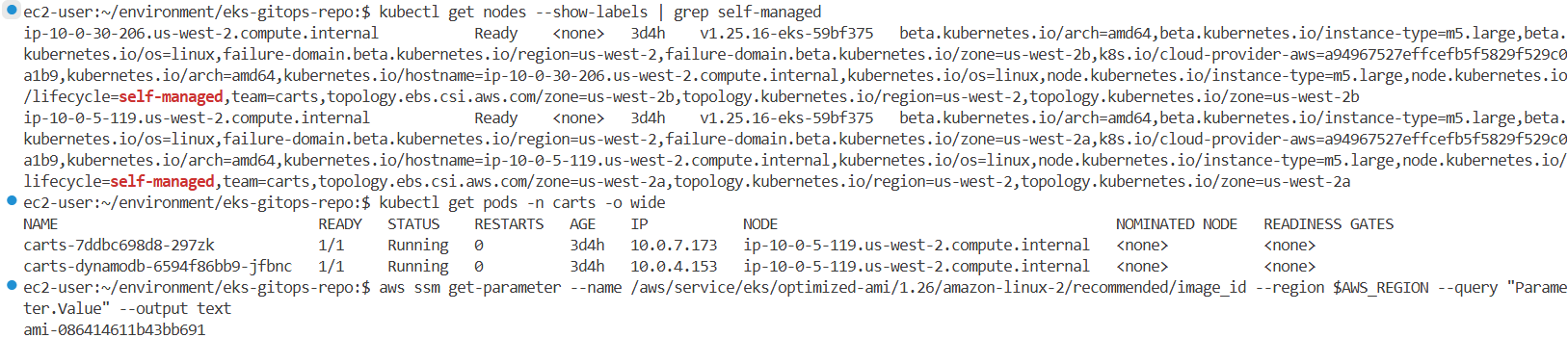 ip-10-0-6-184.us-west-2.compute.internal Ready <none> 30h v1.25.16-eks-59bf375 beta.kubernetes.io/arch=amd64,beta.kubernetes.io/instance-type=m5.large,beta.kubernetes.io/os=linux,failure-domain.beta.kubernetes.io/region=us-west-2,failure-domain.beta.kubernetes.io/zone=us-west-2a,k8s.io/cloud-provider-aws=a94967527effcefb5f5829f529c0a1b9,kubernetes.io/arch=amd64,kubernetes.io/hostname=ip-10-0-6-184.us-west-2.compute.internal,kubernetes.io/os=linux,node.kubernetes.io/instance-type=m5.large,node.kubernetes.io/lifecycle=self-managed,team=carts,topology.ebs.csi.aws.com/zone=us-west-2a,topology.kubernetes.io/region=us-west-2,topology.kubernetes.io/zone=us-west-2a