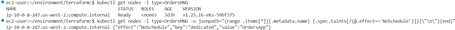 ip-10-0-24-213.us-west-2.compute.internal [{"effect":"NoSchedule","key":"dedicated","value":"CheckoutApp"}]