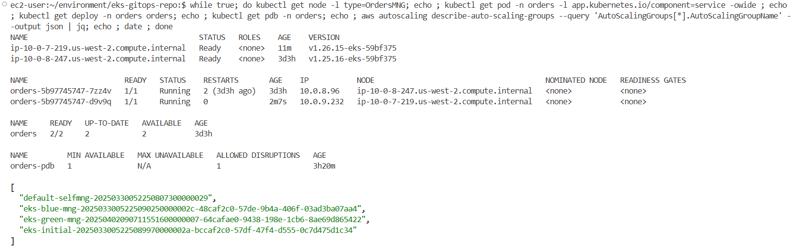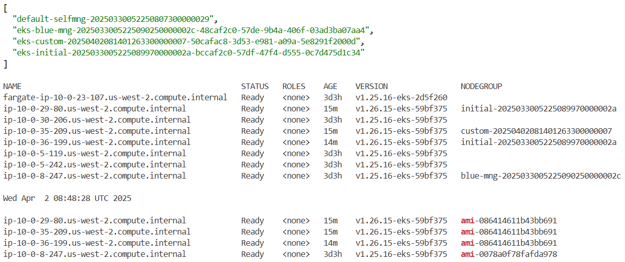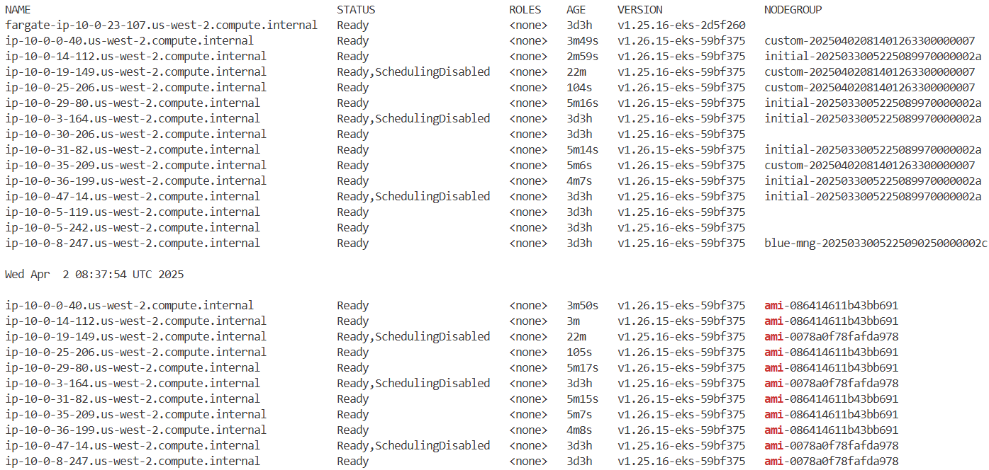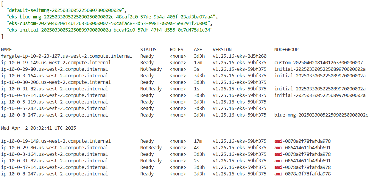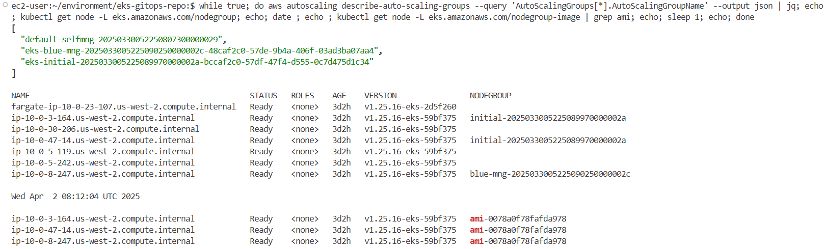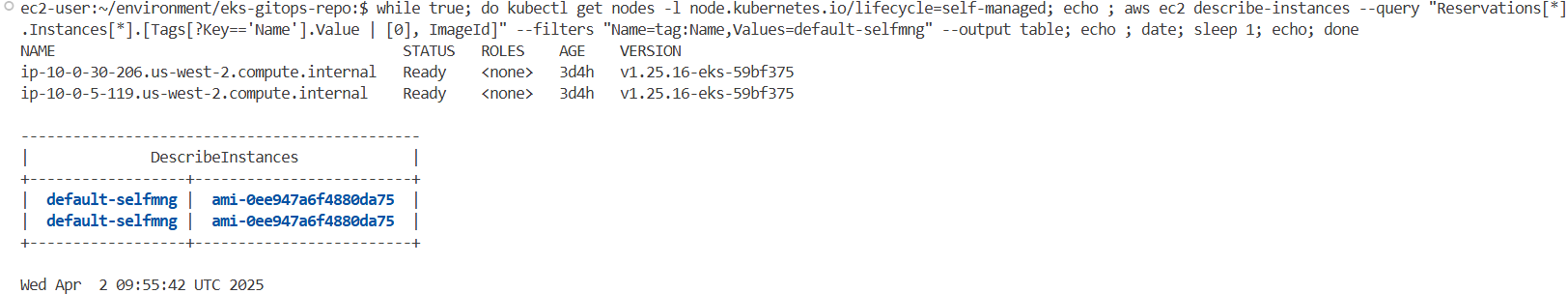 while true; do kubectl get nodes -l node.kubernetes.io/lifecycle=self-managed; echo ; aws ec2 describe-instances --query "Reservations[*].Instances[*].[Tags[?Key=='Name'].Value | [0], ImageId]" --filters "Name=tag:Name,Values=default-selfmng" --output table; echo ; date; sleep 1; echo; done