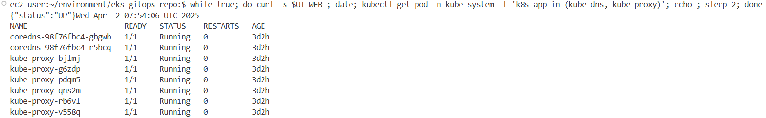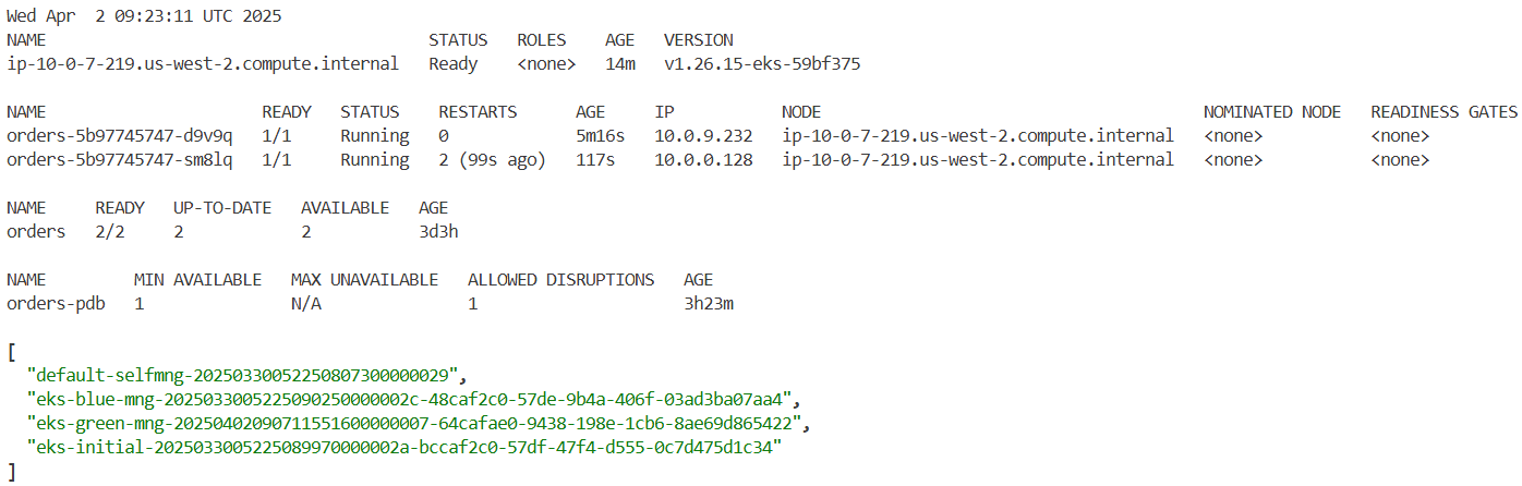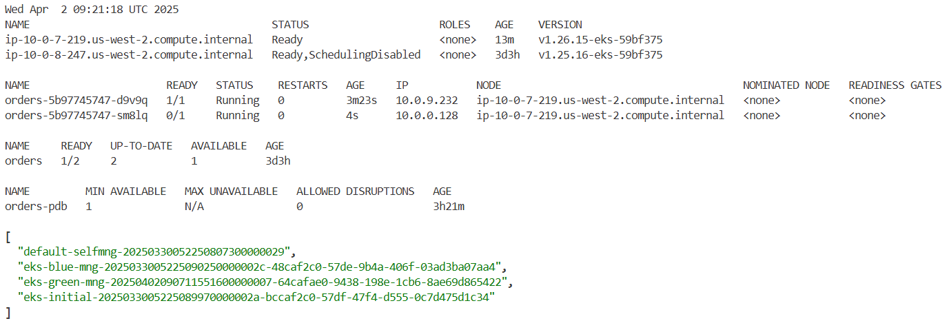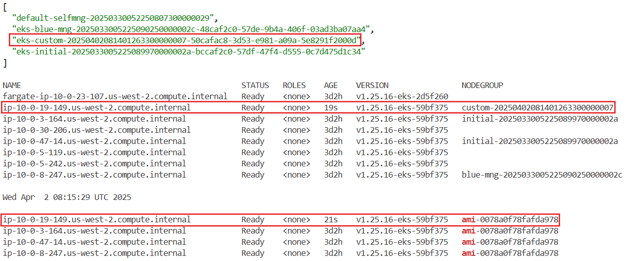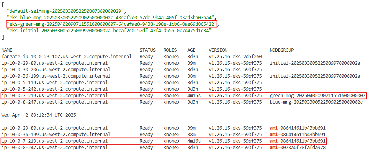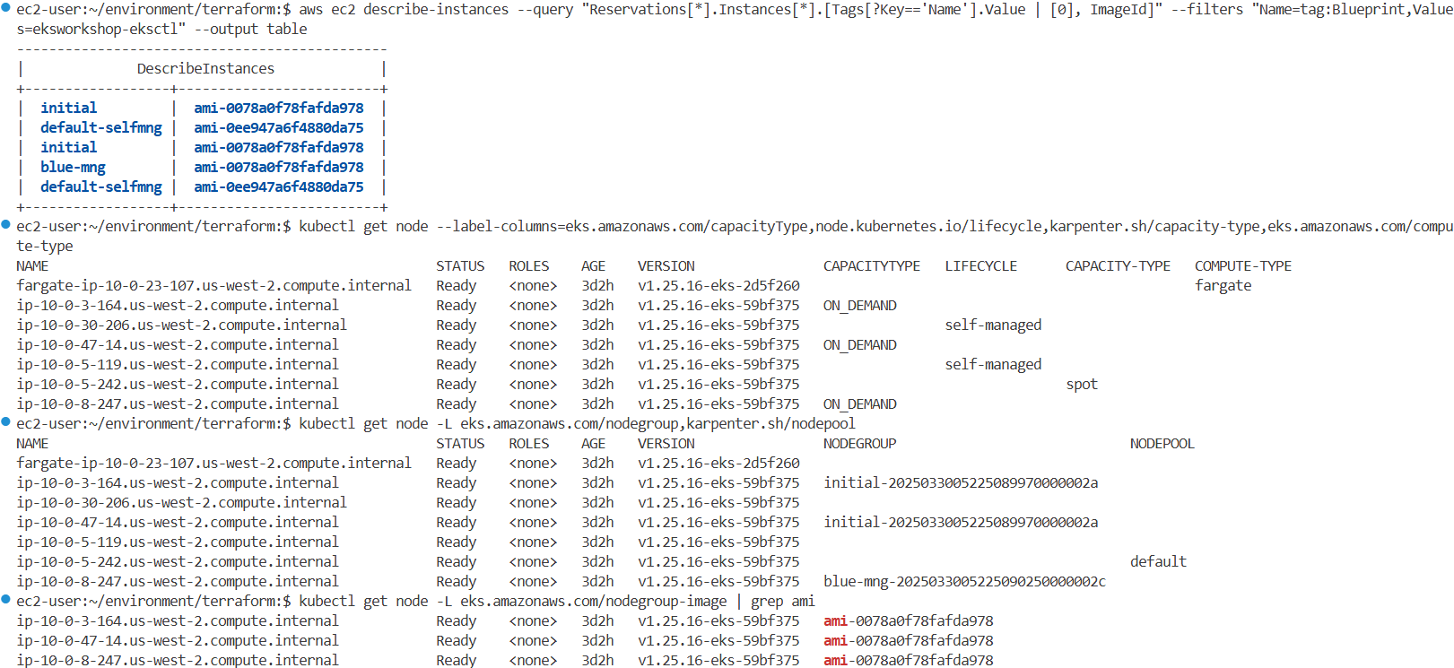 while true; do kubectl get nodes -l node.kubernetes.io/lifecycle=self-managed; echo ; aws ec2 describe-instances --query "Reservations[*].Instances[*].[Tags[?Key=='Name'].Value | [0], ImageId]" --filters "Name=tag:Name,Values=default-selfmng" --output table; echo ; date; sleep 1; echo; done