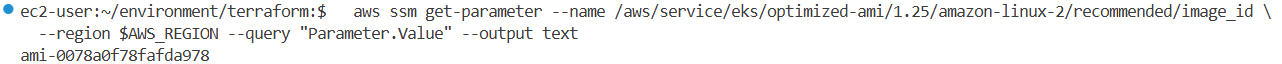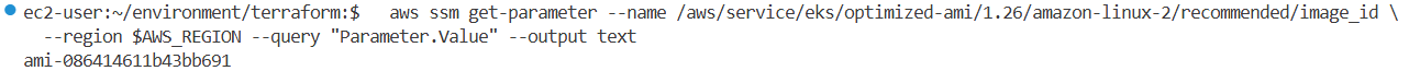 aws ssm get-parameter --name /aws/service/eks/optimized-ami/1.26/amazon-linux-2/recommended/image_id --region $AWS_REGION --query "Parameter.Value" --output text