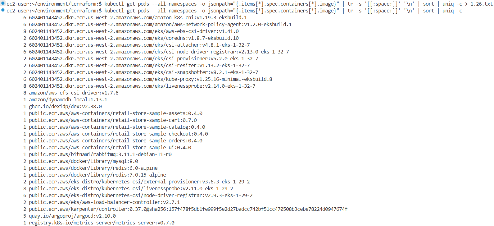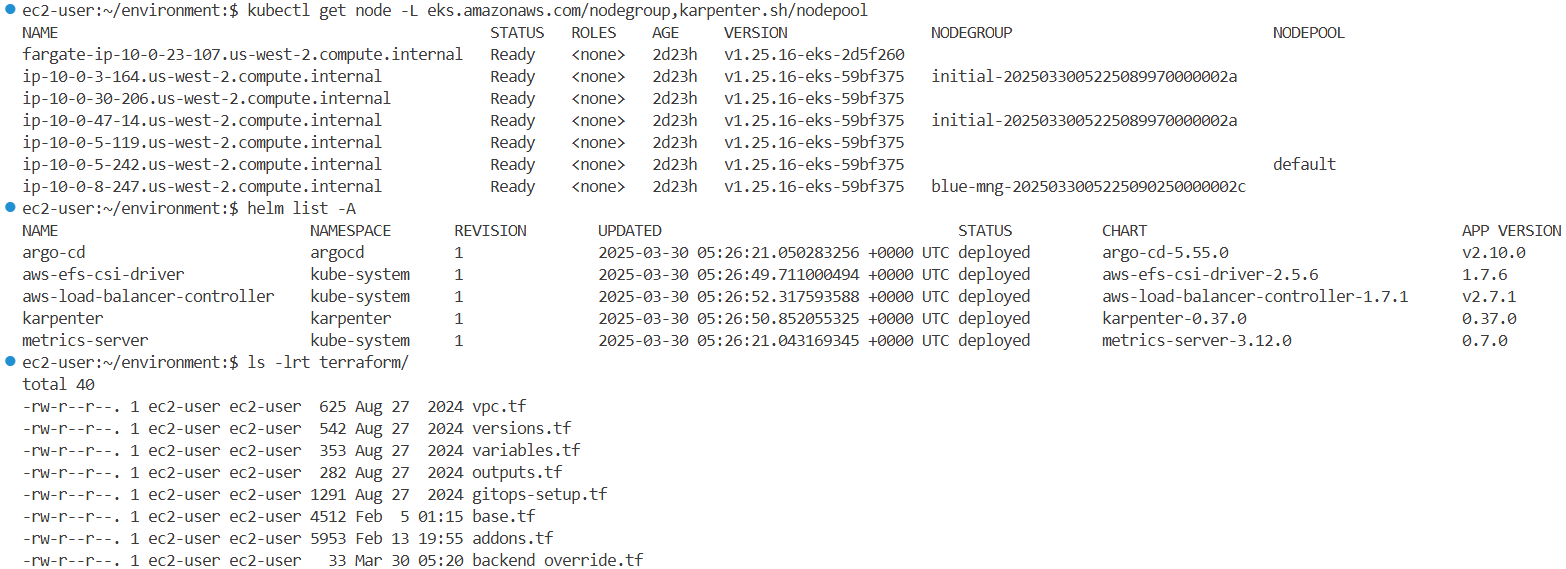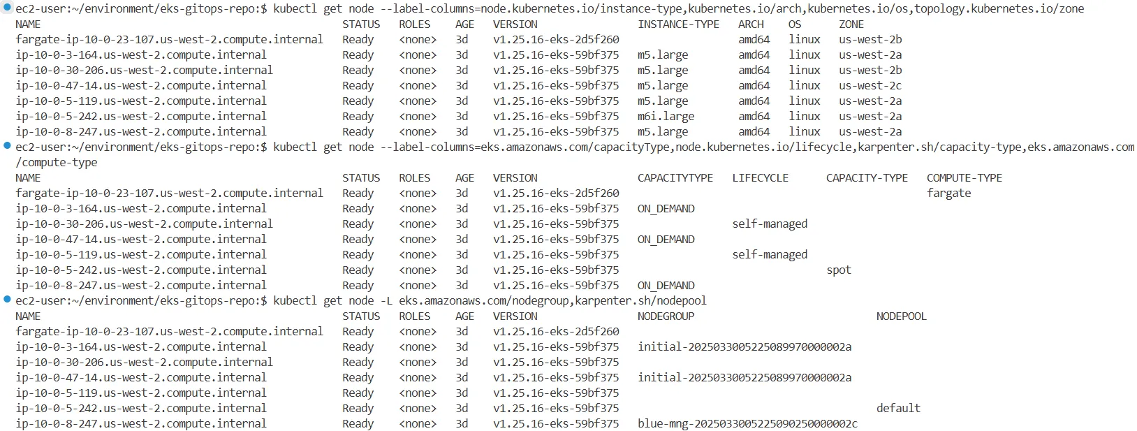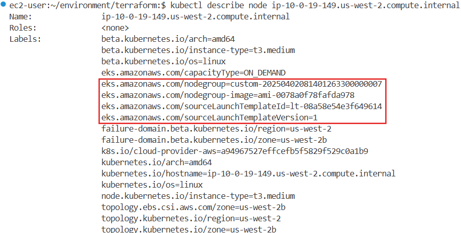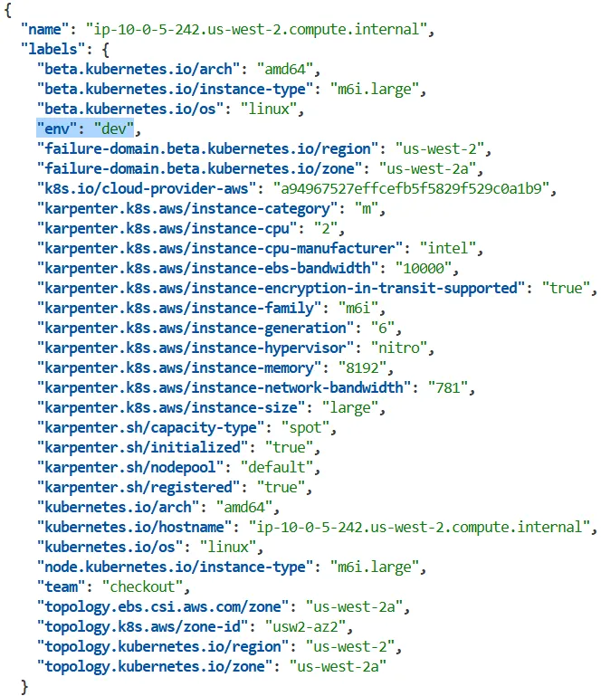ip-10-0-26-119.us-west-2.compute.internal Ready <none> 30h v1.25.16-eks-59bf375 beta.kubernetes.io/arch=amd64,beta.kubernetes.io/instance-type=m5.large,beta.kubernetes.io/os=linux,failure-domain.beta.kubernetes.io/region=us-west-2,failure-domain.beta.kubernetes.io/zone=us-west-2b,k8s.io/cloud-provider-aws=a94967527effcefb5f5829f529c0a1b9,kubernetes.io/arch=amd64,kubernetes.io/hostname=ip-10-0-26-119.us-west-2.compute.internal,kubernetes.io/os=linux,node.kubernetes.io/instance-type=m5.large,node.kubernetes.io/lifecycle=self-managed,team=carts,topology.ebs.csi.aws.com/zone=us-west-2b,topology.kubernetes.io/region=us-west-2,topology.kubernetes.io/zone=us-west-2b