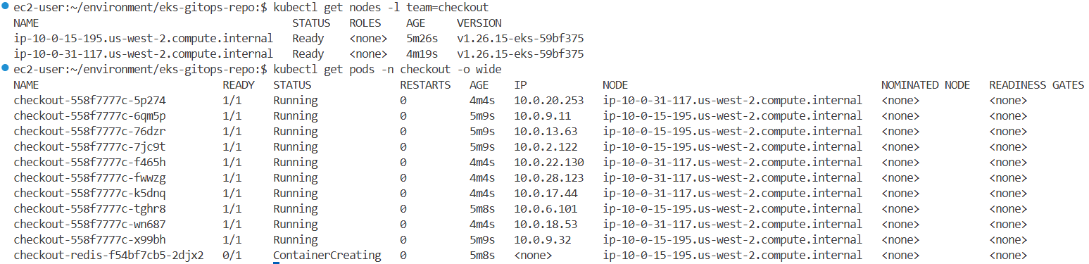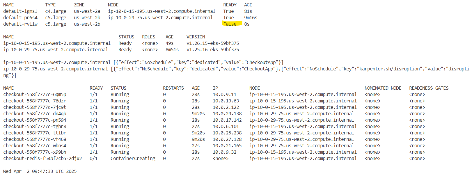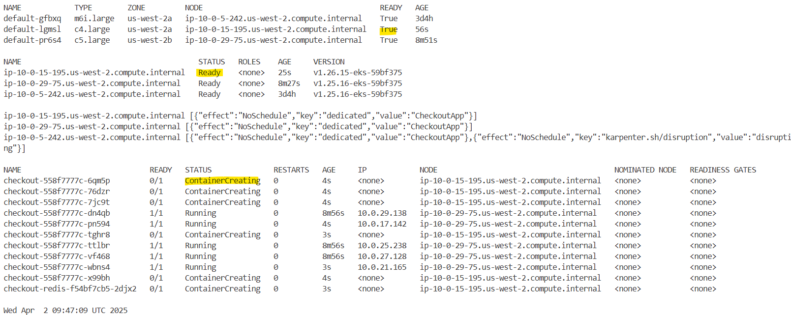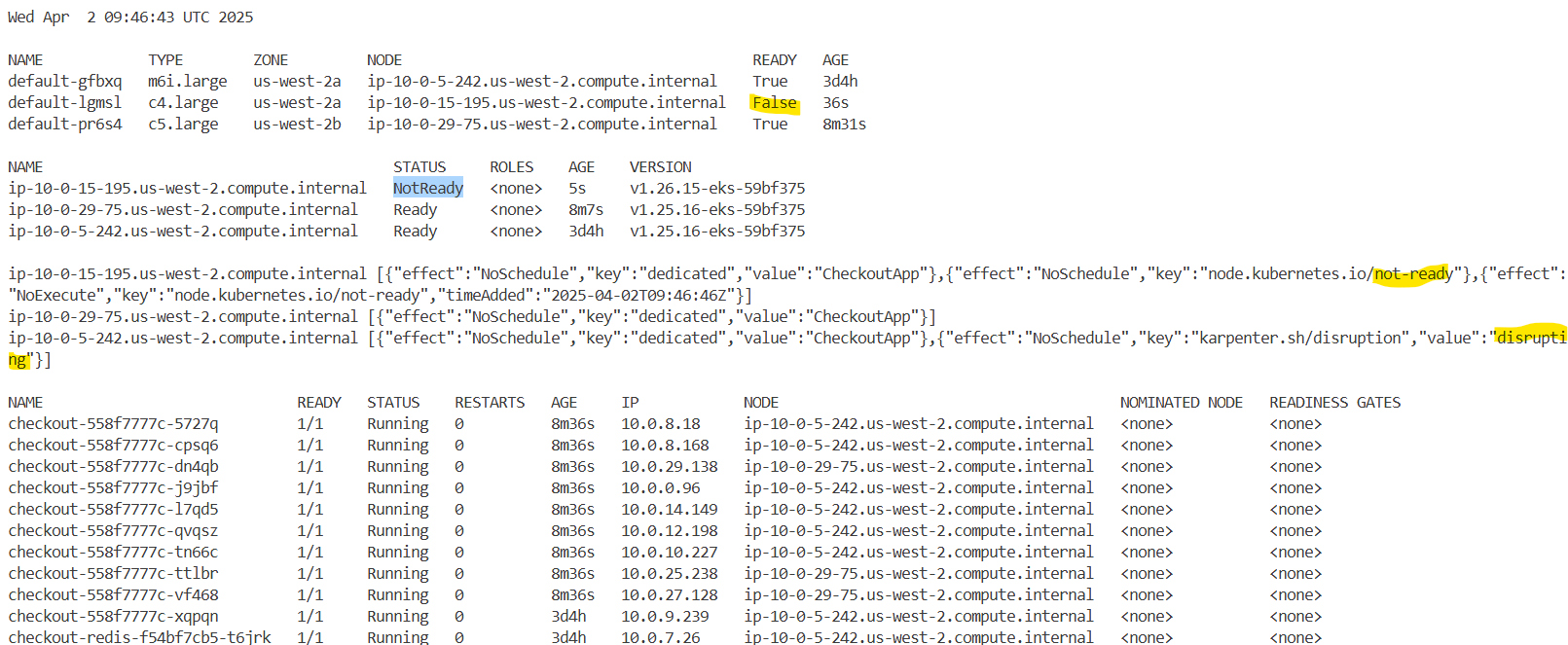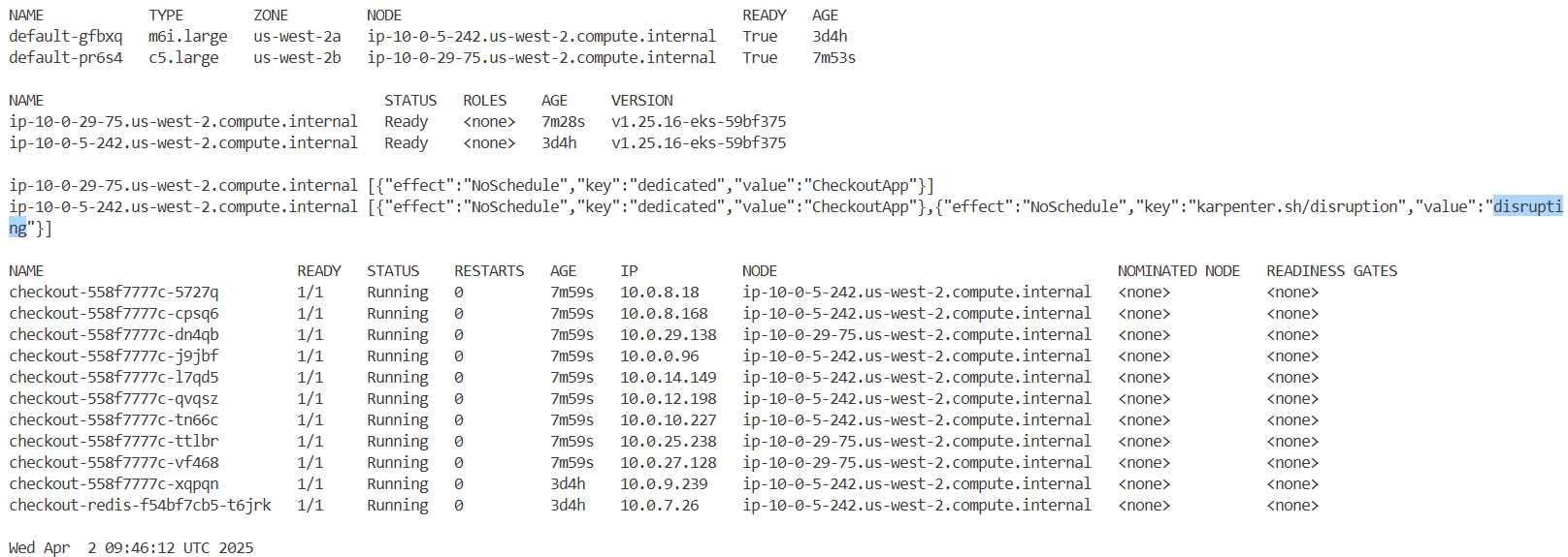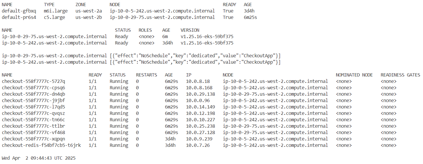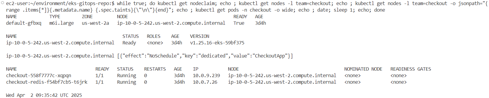while true; do kubectl get nodeclaim; echo ; kubectl get nodes -l team=checkout; echo ; kubectl get nodes -l team=checkout -o jsonpath="{range .items[*]}{.metadata.name} {.spec.taints}{\"\n\"}{end}"; echo ; kubectl get pods -n checkout -o wide; echo ; date; sleep 1; echo; done