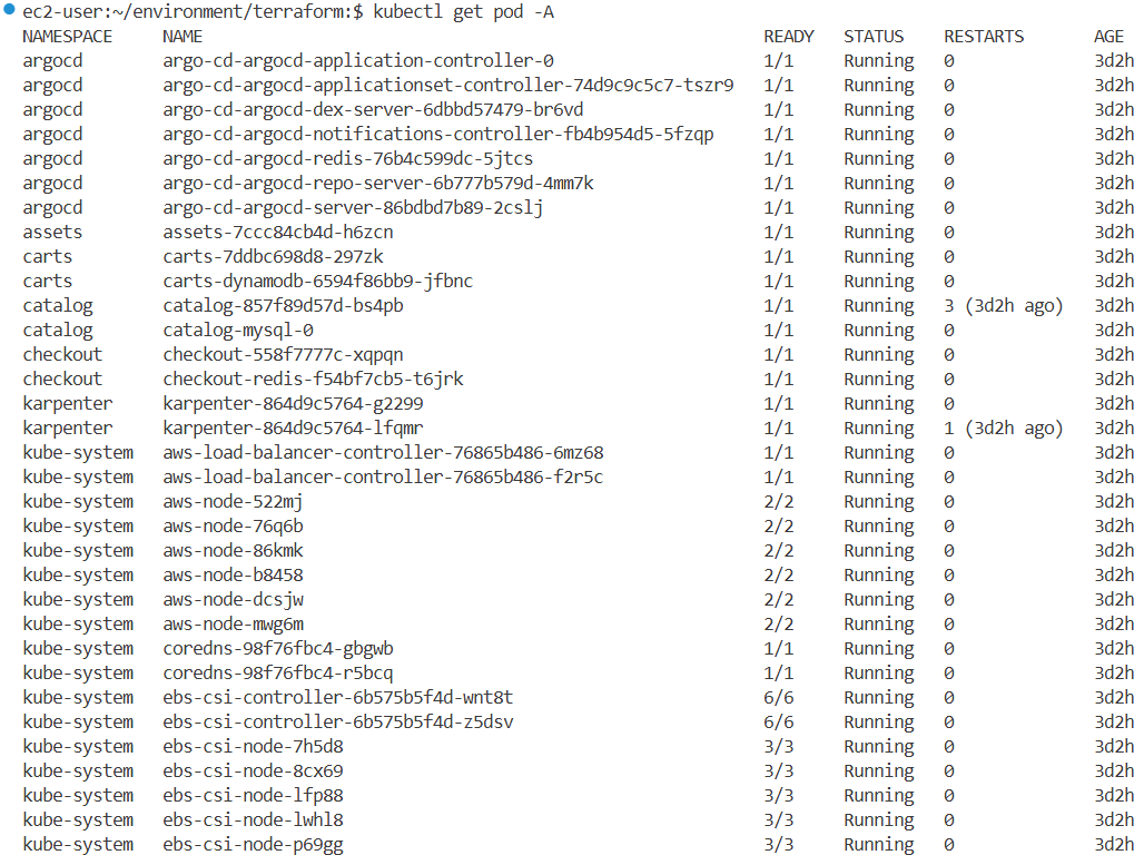 carts-dynamodb-6594f86bb9-8pzk5 1/1 Running 0 30h 10.0.30.122 ip-10-0-26-119.us-west-2.compute.internal <none> <none>