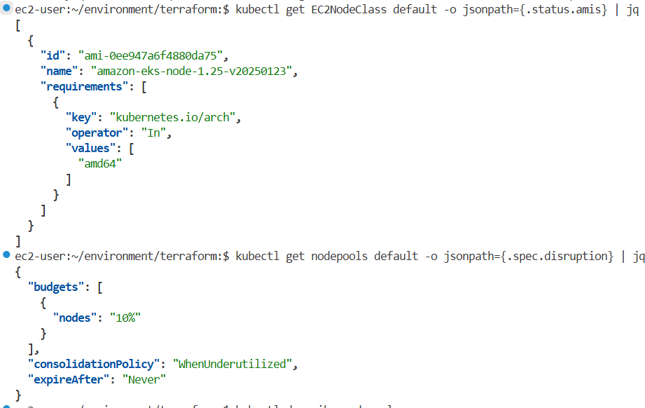 # Karpenter will scale looking at the aggregate resource requirements of unscheduled pods. We will see we have now two nodes provisioned via karpenter.