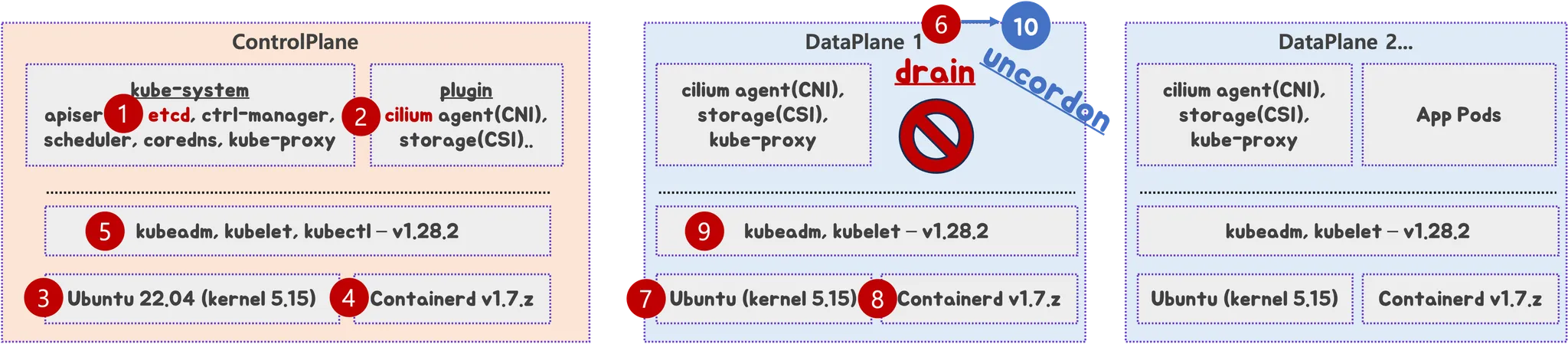 kubectl drain <노드> → 파드 Eviction 및 서비스 중단 여부 모니터링업그레이드 완료 후 각 노드의 상태 점검