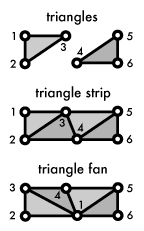 Project된 vertex를 가지고 GPU는 삼각형을 형성한다. 이 때 각 vertex는 3개씩 별도의 삼각형으로 만들어질 수도 있고, trinagle strip이나 triangle fan을 만들어 추가적인 삼각형에 대해 메모리를 아낄 수 있다.