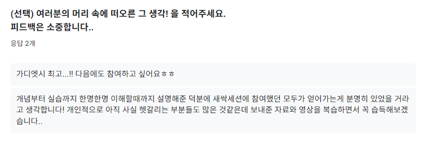 분명 완벽한 세션은 아니었을 텐데 장점으로 느꼈던 부분을 자세하게 적어 주셔서 너무 뿌듯했습니다. 물론 참여한 7명 중 3명만이 조사에 참여했지만, 비율로 따지면 43%이니 만족합니다.
