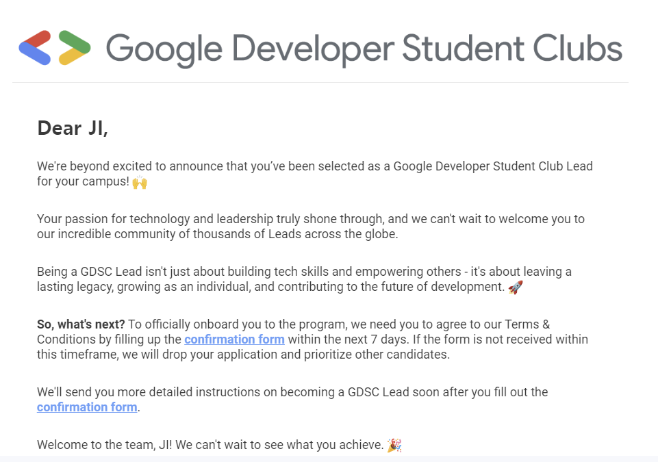 이후 조금의 시간이 흘러, Lead에 선발되었다는 이메일을 받았습니다! 한편으로는 잘 할 수 있을까에 대한 걱정도 있었지만, 당시에는 설렘이 더 앞섰습니다.