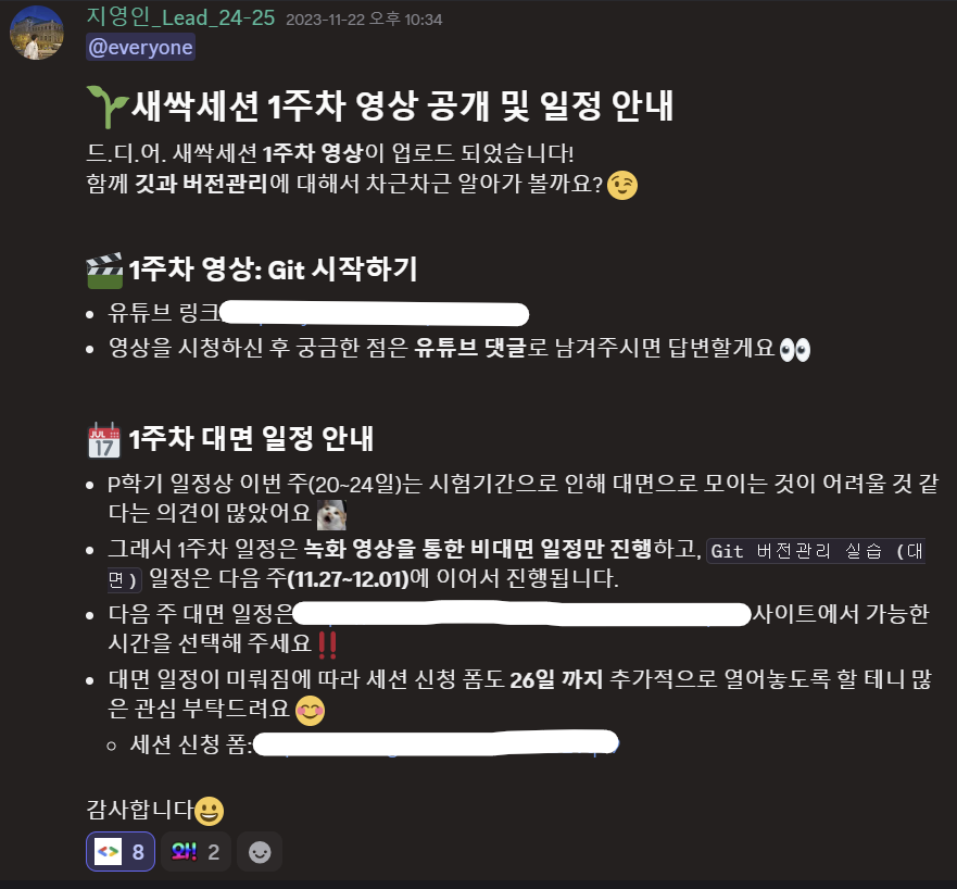 2주차에는 대면으로 만나 명령어 실습을 할 수 있도록 구성했는데요, 대면 참가가 어려운 사람이 있으면 디스코드로 참여할 수 있도록 안내했습니다.