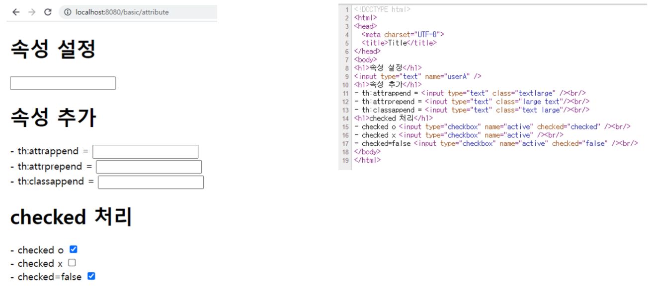 **th:attrappend** : 속성 값의 뒤에 값을 추가한다.**th:attrprepend** : 속성 값의 앞에 값을 추가한다.**th:classappend** : class 속성에 자연스럽게 추가한다.checked 속성은 checked 속성의 값과 상관없이 checked 라는 속성만 있어도 체크가 된다. ( true , false 값을 주로 사용하는 개발자 입장에서는 불편하다.)th:checked 는 값이 false 인 경우 checked 속성 자체를 제거한다.<input type="checkbox" name="active" th:checked="false" /> → <input type="checkbox" name="active" />basicController