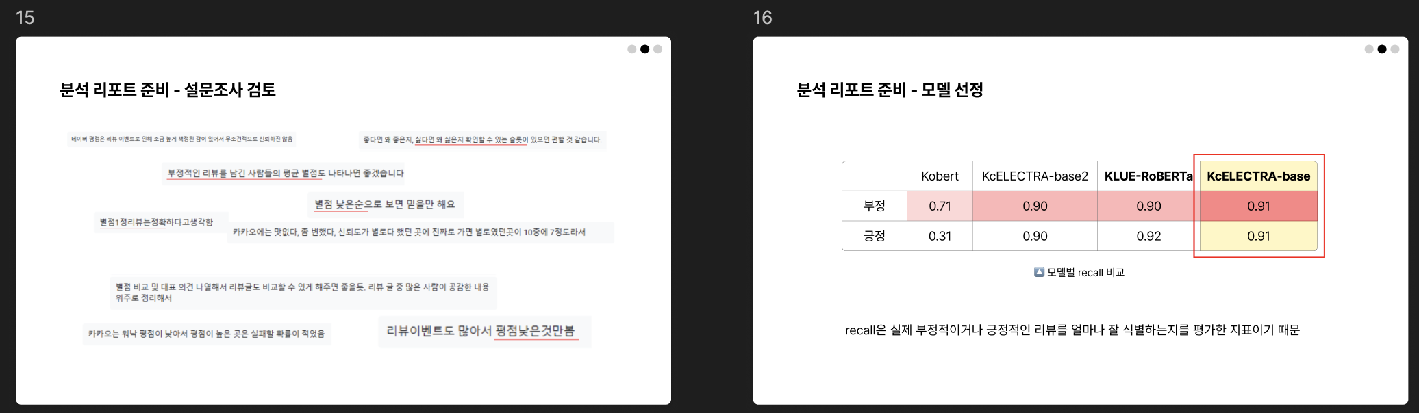유저리서치 기반으로 부정리뷰에 대한 니즈가 있었고, 비정형 데이터 분석 모델을 선정시, 부정리뷰를 잘 분석하는 녀석으로 선택했음