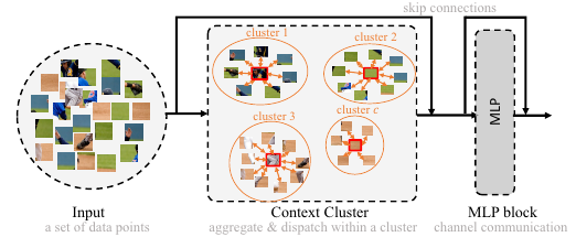 - 즉, 하나의 이미지를 여러 data points의 집합으로 보고 모든 points가 적절한 cluster로 그룹화함 (Context Cluster, CoC)