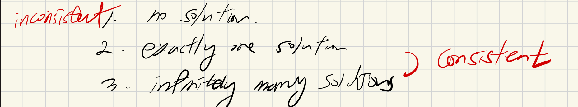 no solution일때 inconsistent 라고 하며, 한개 or 무수히 많은 해 집합일때 consistent 하다고 표현