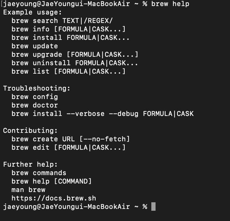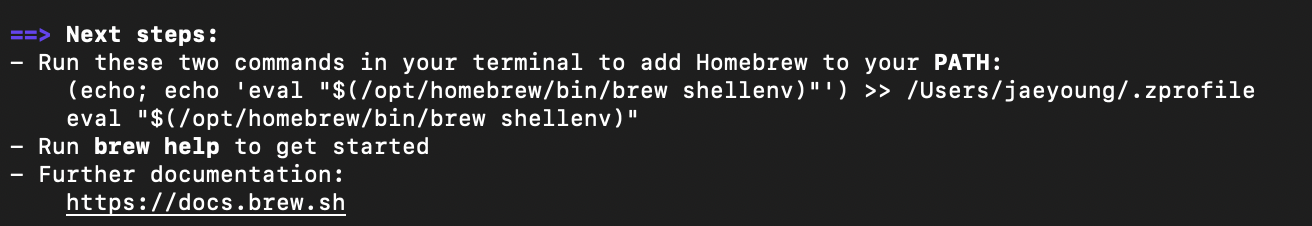 이후 next step의 설명과 같이 brew help 를 실행하고 에러가 안뜨면 정상적으로 환경변수 설정이 완료된거다.