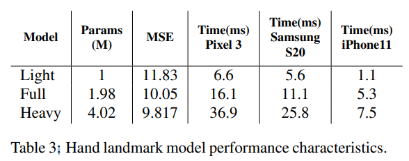 위 표에서는 파라미터의 정도에 따라 모델의 크기를 나누고, 모바일 별 실행 시간 비교하고 있음. Heavy는 확실히 파라미터의 양이 많아진 만큼 오차가 줄었지만 실행 시간이 너무 오래 걸리는 것을 볼 수 있고, Light와 Full은 Heavy에 비해 빠르지만 오차가 조금 더 큰 것을 볼 수 있음.