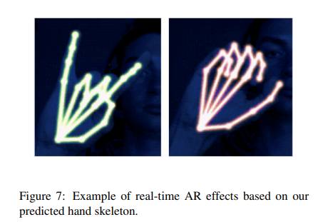 논문에서는 손의 골격을 바탕으로 하여 골격 위에 AR 효과를 씌우는 것을 제안함. 아래 그림과 같이 골격을 네온 스타일로 랜더링 할 수 있음.