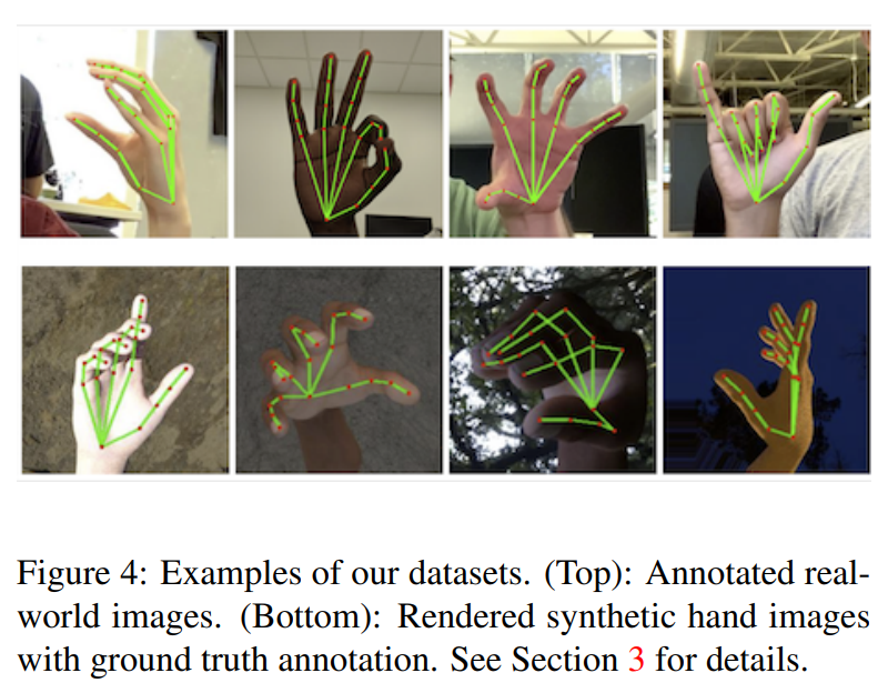현실 이미지에 21개의 특징점에 대한 주석을 모두 달고, 인위적 이미지는 3D 관절을 투영하여 정답 데이터(Ground-Truth)로 사용함.