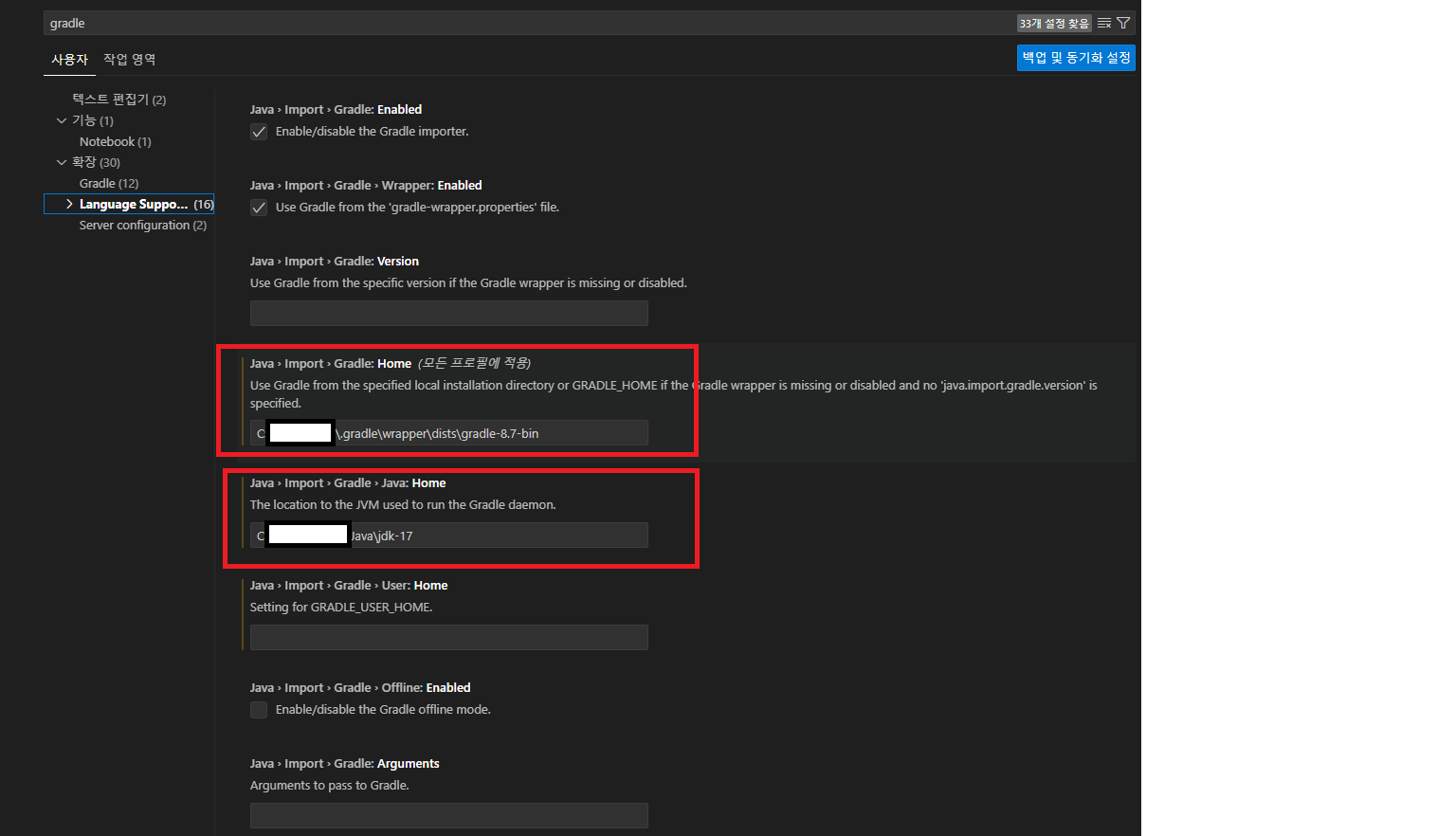 vscode 설정에 들어가서 gradle을 검색하고 Gradle:Home에 gradle 설치 경로를 입력해준다.