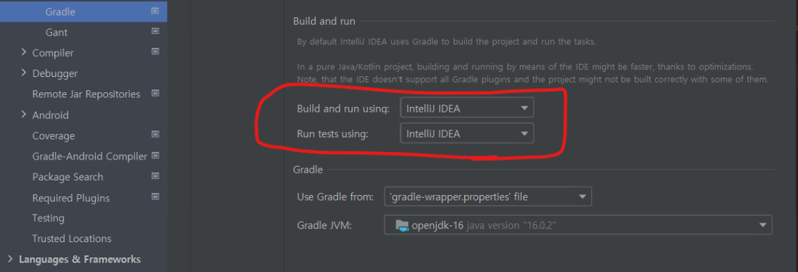 intellij settings -> Gradle에서 Build and run using Intellij IDEA로 바꿔주기.