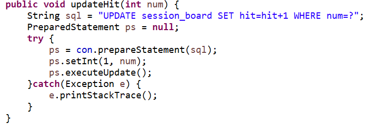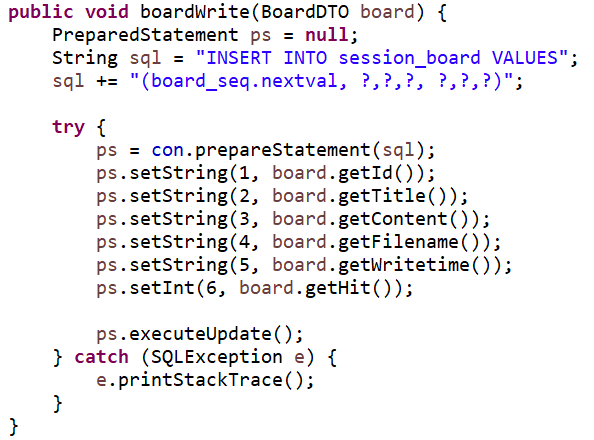 우선 board에 대한 DB테이블을 session_board란 이름으로 새로 추가해주었으며 컬럼은 num, id, title, content, filename, writetime, hit로 구성되어있다.