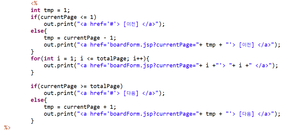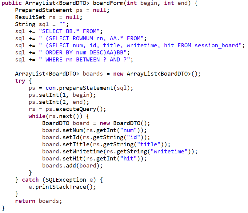 boardForm에 대한 DAO에서의 SQL쿼리는 위와 같이 구성하여 ORDER BY DESC를 이용하여 가장 최근에 쓴 글로 정렬하였으며 시작페이지와 끝페이지의 설정으로 뷰에 보여질 정보들을 java로 코딩하여 설정해서 값을 넣어 데이터베이스의 값들을 받아오도록 설정해두었다.
