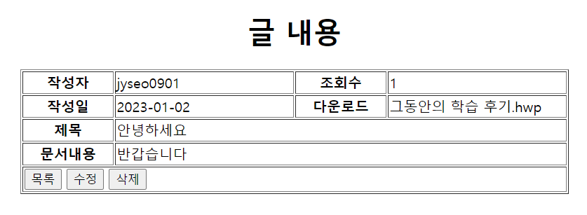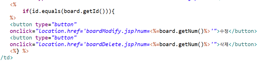 뷰에서의 수정과 삭제버튼은 로그인한 사용자와 글쓴 사용자의 아이디가 일치할 경우에만 나타나도록 설정함으로써 나무나 수정하지 못하도록 설정해 두었다.