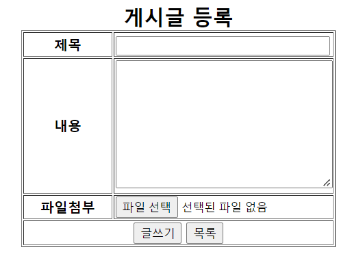 게시글 등록 페이지는 제목과 내용, 파일첨부, 글쓰기버튼과 목록이 나타난다.