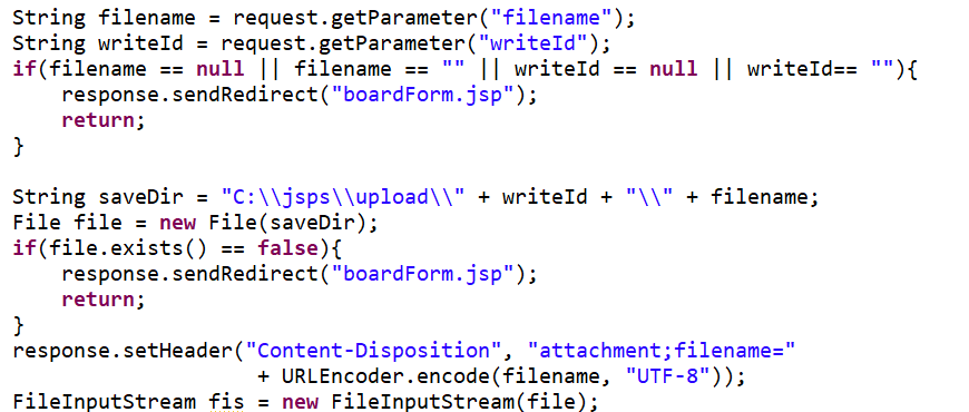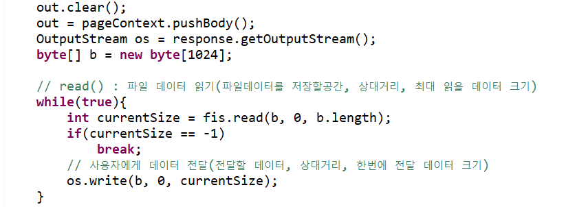 while을 이용하여 파일 데이터를 읽고 파일의 데이터 끝이 -1을 만나게 되면 끝을 냄으로써 파일을 다운로드 받을 수 있도록 한다.