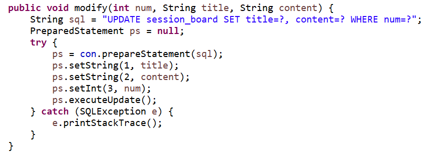 수정하게 되면 아까 uri에서 넘겨받은 num을 파라미터로 받아와 값을 WHERE값에 설정을 해 두어 그 대상만 바뀌게 하도록 하였다.