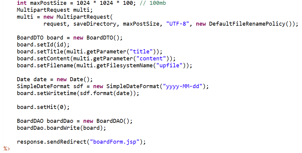 오버로드한 파일의 설정을 해주고 multi.getParameter를 이용하여 제목과 내용을 DTO에 값을 설정해주었다.