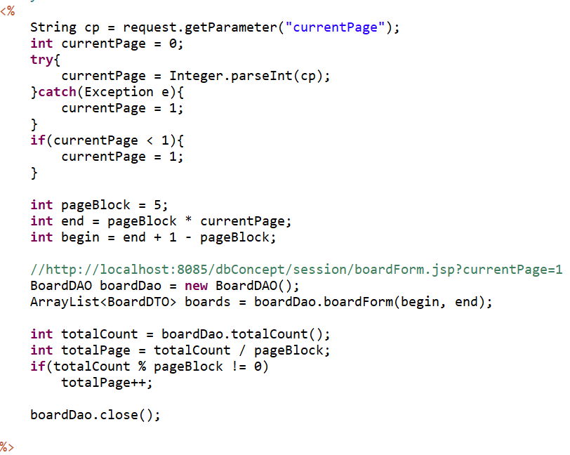 try catch를 이용하여 String값이었던 currentPage값을 int형으로 바꿔주어 currentPage매개변수에 저장하면서 현재 페이지의 값을 설정해주었다.