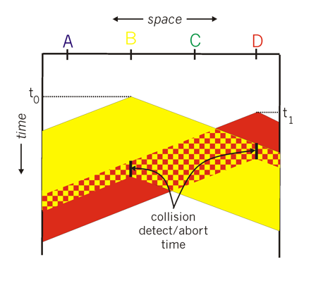 CSMAμλ λ€λ₯΄κ², μΆ©λμ΄ λ°μνλ©΄ λ Έλλ μ§§μ μκ°λ΄μ μ΄λ₯Ό κ°μ§νκ³ μΆ©λλ λ°μ΄ν°λ₯Ό μ μ‘ μ€λ¨νλ€.