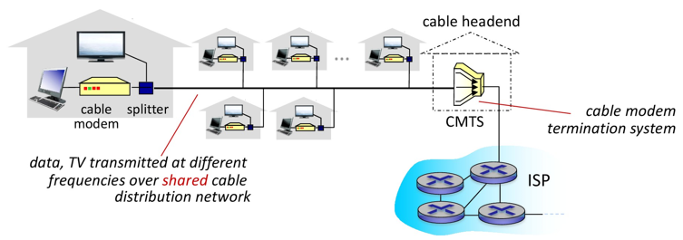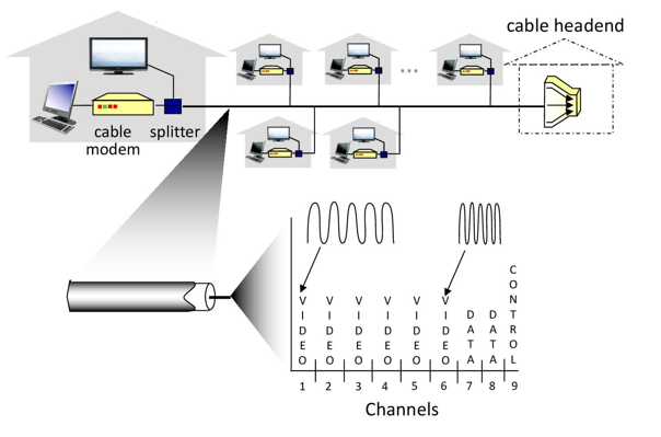 ๋ค์ํ ์ฑ๋์ด ๋ค์ํ ์ฃผํ์ ๋์ญ์์ ์ ์ก๋์ด, ์ธํฐ๋ท๊ณผ TV ์์ฒญ์ด ๋์์ ๊ฐ๋ฅํ๋ค. (= ์ฃผํ์ ๋ถํ ๋ค์คํ, Frequency Division Multiplexing)