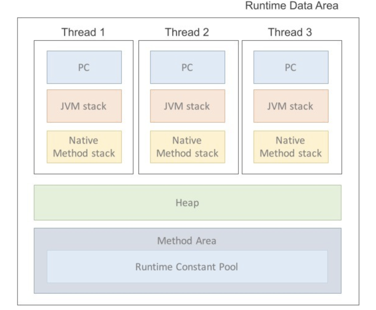 JVM이 운영체제로부터 할당받은 메모리 영역. JVM은 이 영역에 자바 어플리케이션에서 사용하는 데이터들을 적재한다.