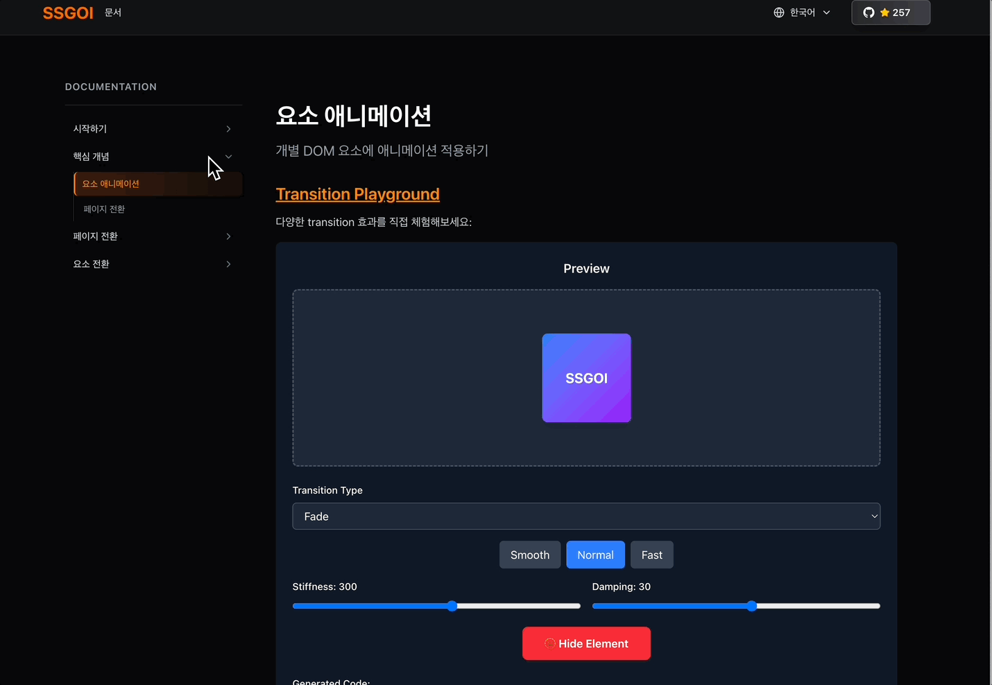 SSGOI의 핵심은 스프링 물리 기반 애니메이션 엔진입니다: